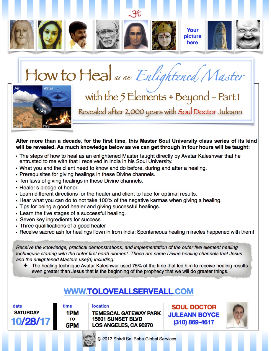 « All Events This event has passed. How to Heal as an Enlightened Master – Part I October 28, 2017 @ 1:00 pm - 5:00 pm Event Navigation « Annual Meditation for World Peace + Connecting with Shirdi Sai Baba Friday, September 29, 2017 8-10pm New Moon Meditation + Master Class » + Google Calendar+ iCal Export Details Date: October 28, 2017 Time: 1:00 pm - 5:00 pm Organizer Soul Doctor Juleann Phone: (310) 869-4617 Venue adminHow to Heal as an Enlightened Master – Part I11.06.2017