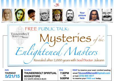 « All Events This event has passed. FREE TALK: Mysteries of the Enlightened Masters May 21, 2015 @ 7:30 pm - 9:00 pm Event Navigation « New Moon Meditation Soulmates » Download the PDF file . + Google Calendar+ iCal Export Details Date: May 21, 2015 Time: 7:30 pm - 9:00 pm Event Category: Public Talks - By donation Venue THUNDERBOLT SPIRITUAL BOOKSTORE 512 SANTA MONICA BLVD , LOS ANGLES, CA 90401 United States + Google Map Phone: (310) 869-4617 adminFREE TALK: Mysteries of the Enlightened Masters05.15.2015